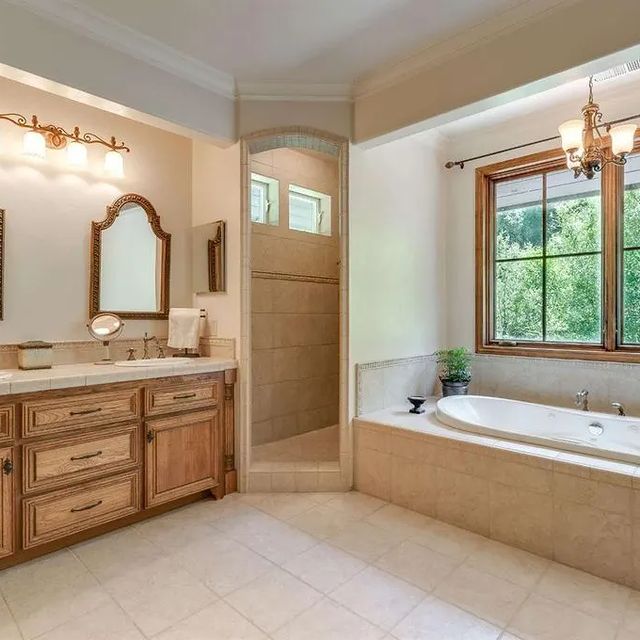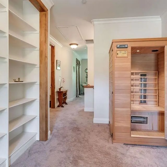 Upstairs there is an incredible and giant Master Suite, two bedrooms, a library, a wood infrared sauna and an additional living room. The Master suite features a wooden four poster bed, a gas fireplace in the bedroom, a private sitting room that could be used for a vanity room, art or yoga, or even a baby’s room. The Master Suite offers a very large walk in closet, a private balcony overlooking the creek and meadow, and a luxurious large bathroom with a whirlpool tub beneath large picture windows looking to the meadow. There is a separate walk-in tiled shower and a separate toilet room and additional closets.