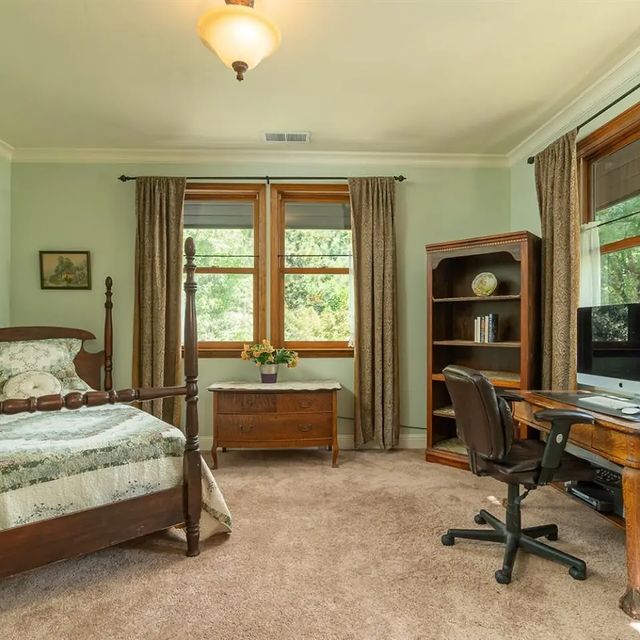 The home features 10′ ceilings on both levels, and as many as five bedrooms, and three and a half bathrooms. The bedrooms could also be used as home offices, crafting or exercise rooms, or whatever you can imagine. There are closets in every room and in every hallway and bathroom, there is so much storage space throughout this home. Downstairs you will find the living room with wood burning fire place, a large dining area, a true chef’s kitchen, a breakfast dining room, and an attached “au-pair” suite. The kitchen has a walk in pantry, abundant cabinetry throughout, a 6 burner gas grill, two ovens and a warming tray. The fridge is oversized as well. Built in spice rack cabinets, and many other unique features. There is a separate bar area between the kitchen and breakfast dining room. There is a large deck to the west side of the house that is perfect for parties, and features a large grill, fire pit, tons of seating and a hot tub. The Au-pair suite, which can be closed off from the main house, has been used as an airbnb in the past as it has a separate entrance, a living room, bedroom and bathroom with clawfoot tub.
