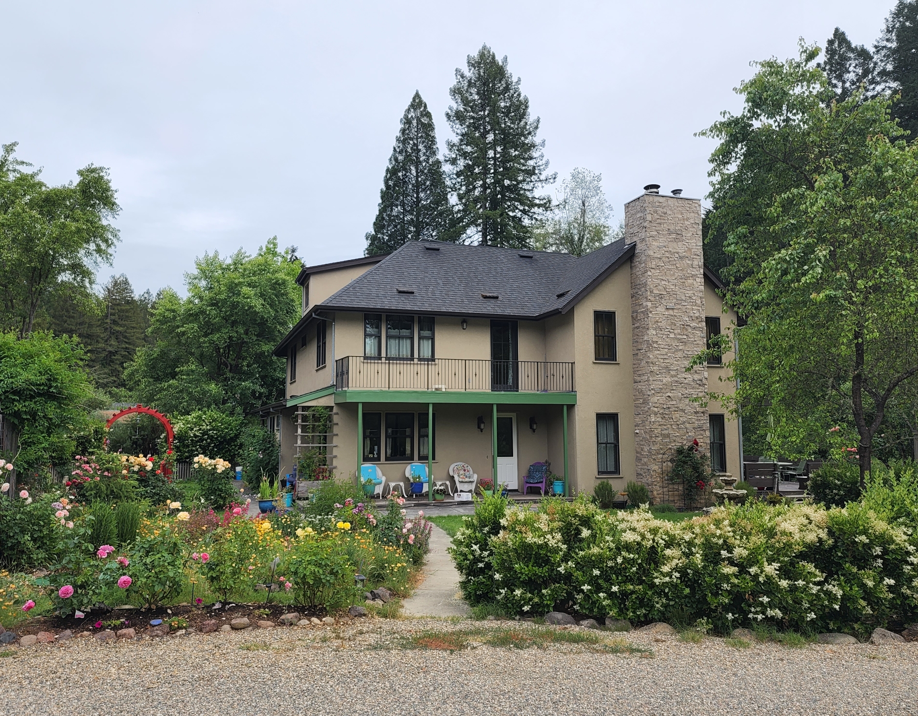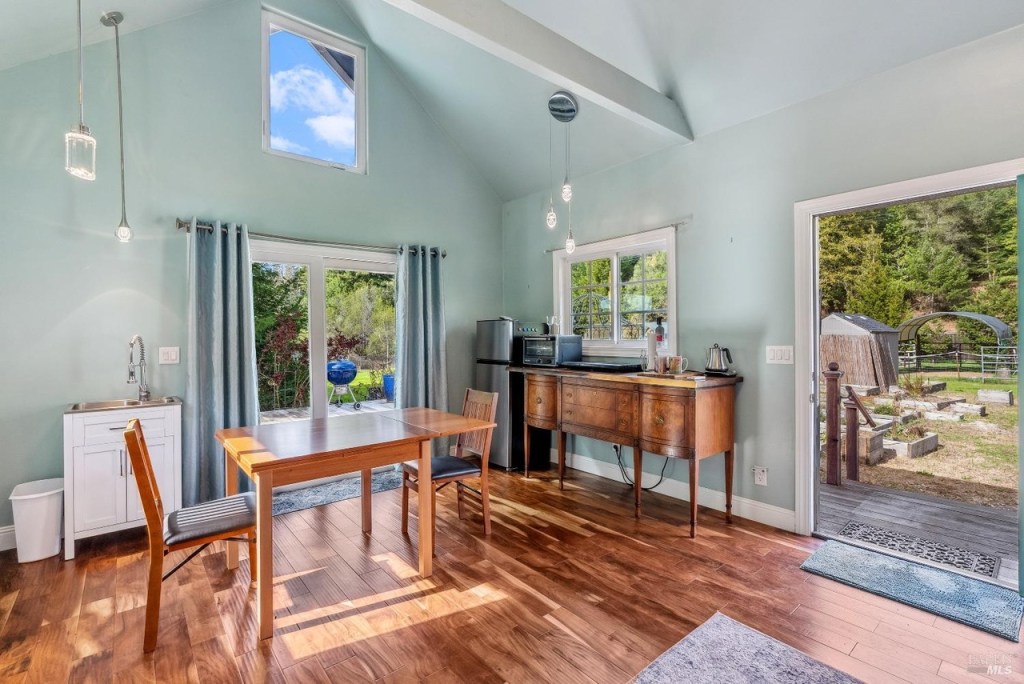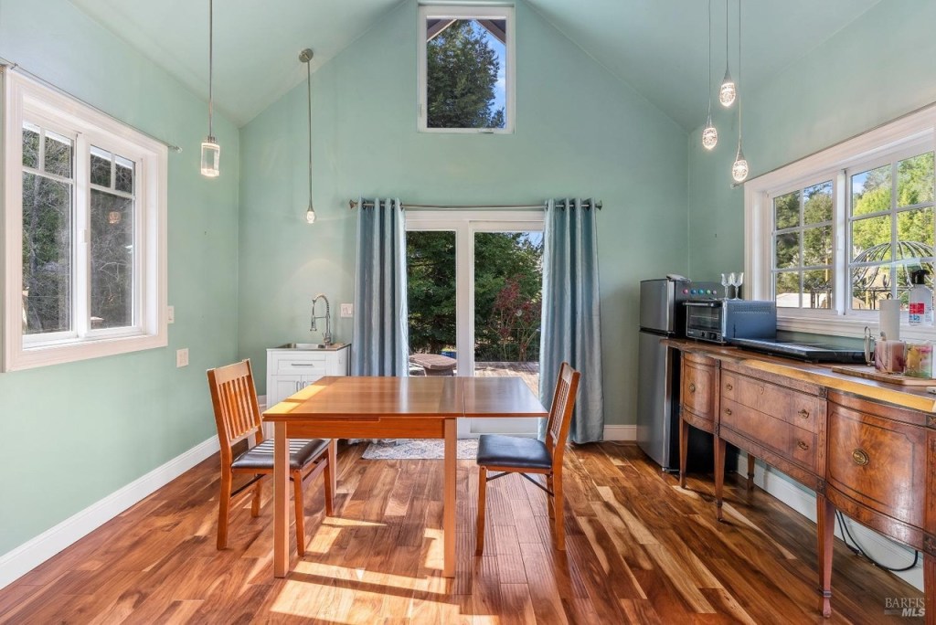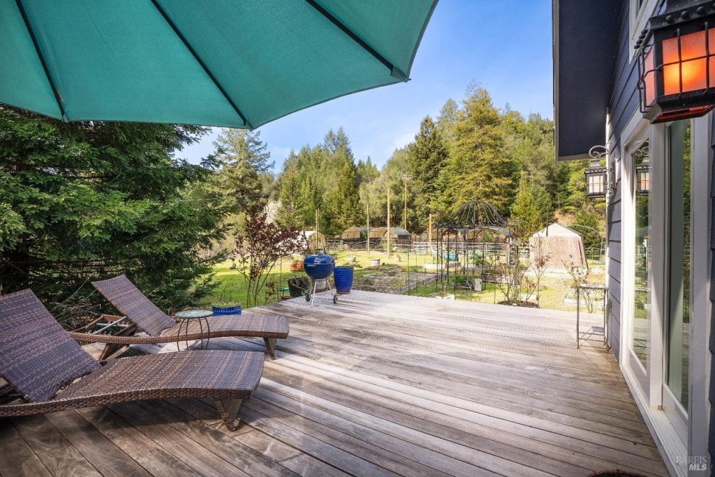 This large and fully furnished French Farmhouse is just a short walk from the Russian River, with the babbling Pocket Canyon Creek meandering through the property. A classic wooden bridge takes you across the creek to the “Wedding Meadow”, a two acre plus sunny grass meadow surrounded by towering redwoods and bays filling the property with fresh oxygen and fragrances of the forest. Prolific blossoming gardens surround the home on all sides, and offer fresh bouquets for the home. Eight solar roof panels were recently installed and cut the electric bill by half!