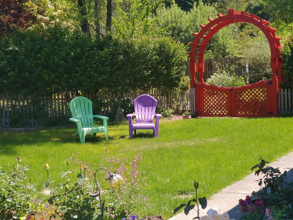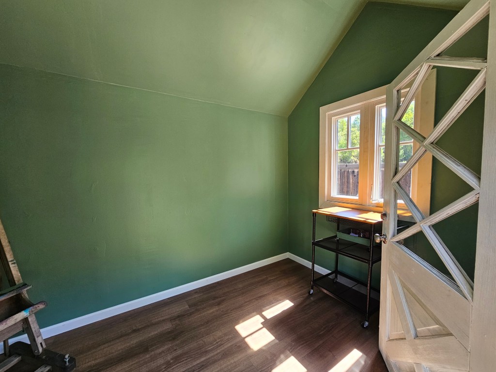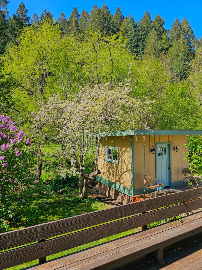 The stand alone cottage sits in the sun surrounded by roses and and irrigated floral landscaping. A gorgeous multi level deck surrounds the cottage using Ipe exotic hardwood decking which is strong as Iron and low maintenance. Crystal windows throw rainbows in the designated basin bathtub and vanity room. A separate room had another sink vanity, a shower and a toilet. The main room holds the bed, living area, dining area and a kitchenette. A small walk-in closet, and a large loft sitting area could also be made into a more private bedroom.