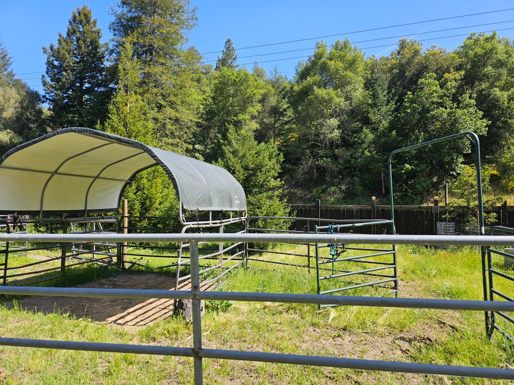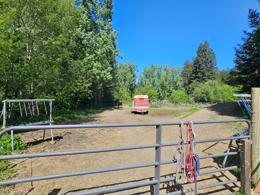 The Property – 4.6 Acres, 2 acres fenced with multiple gates for horses, a tack shed